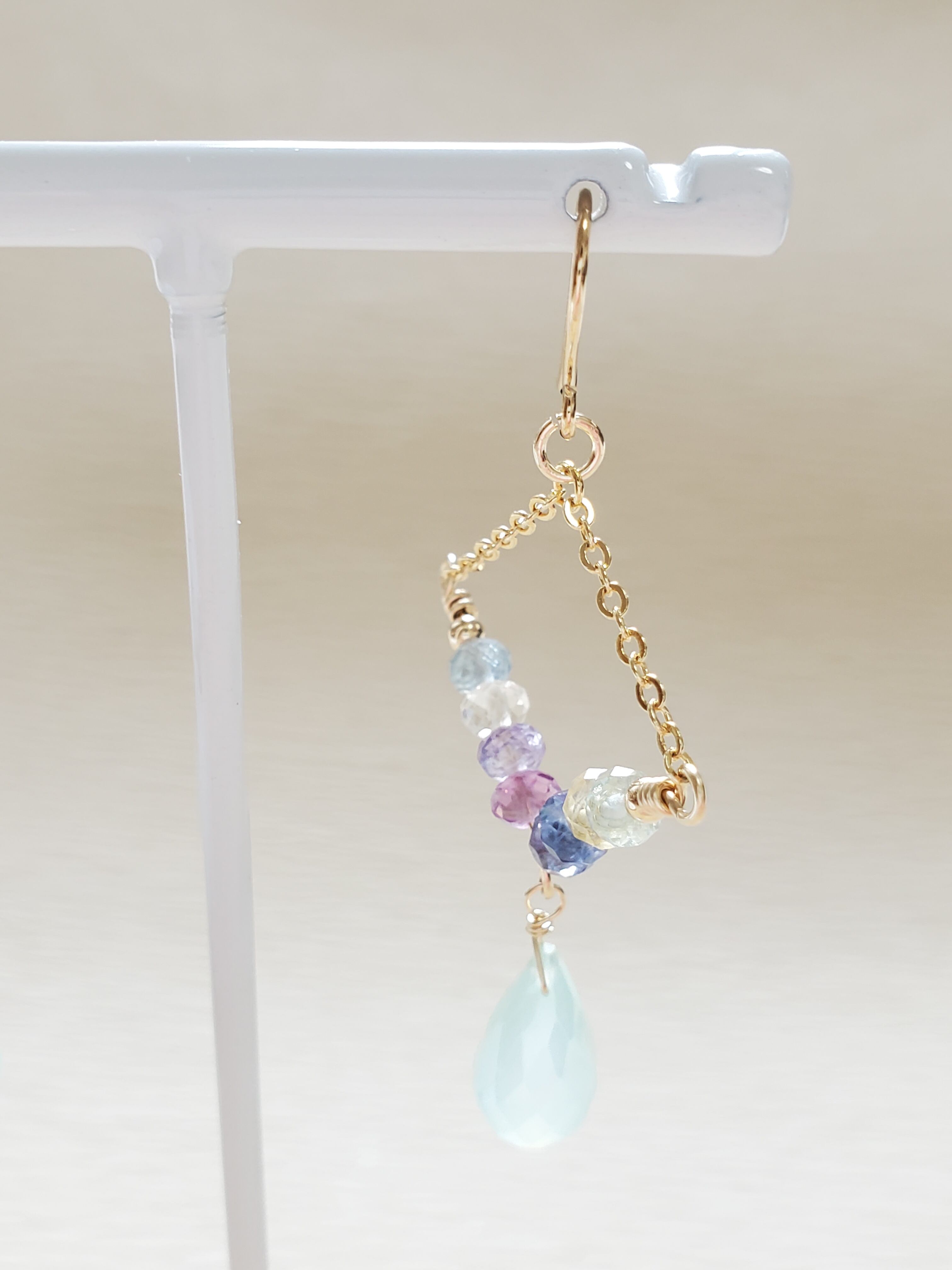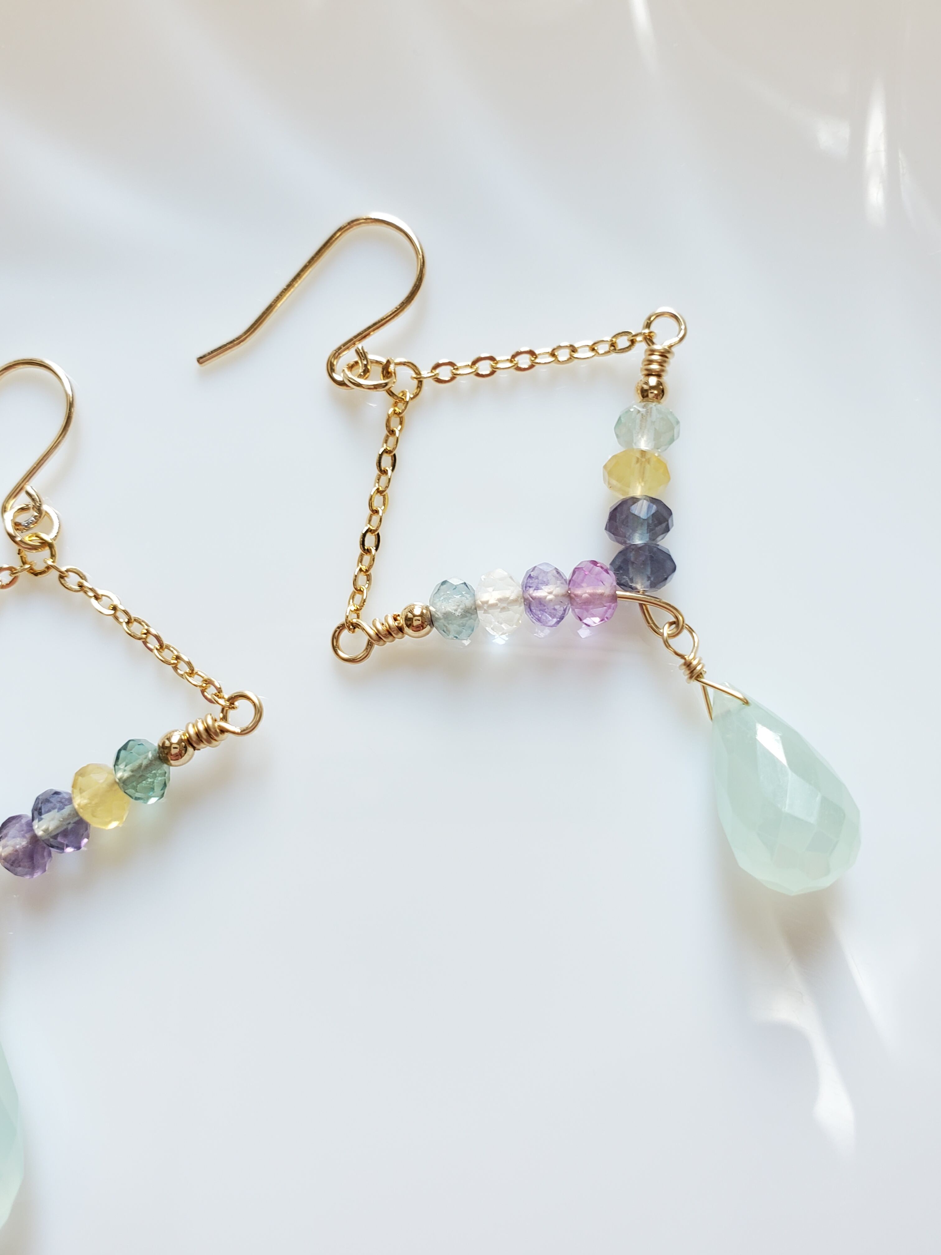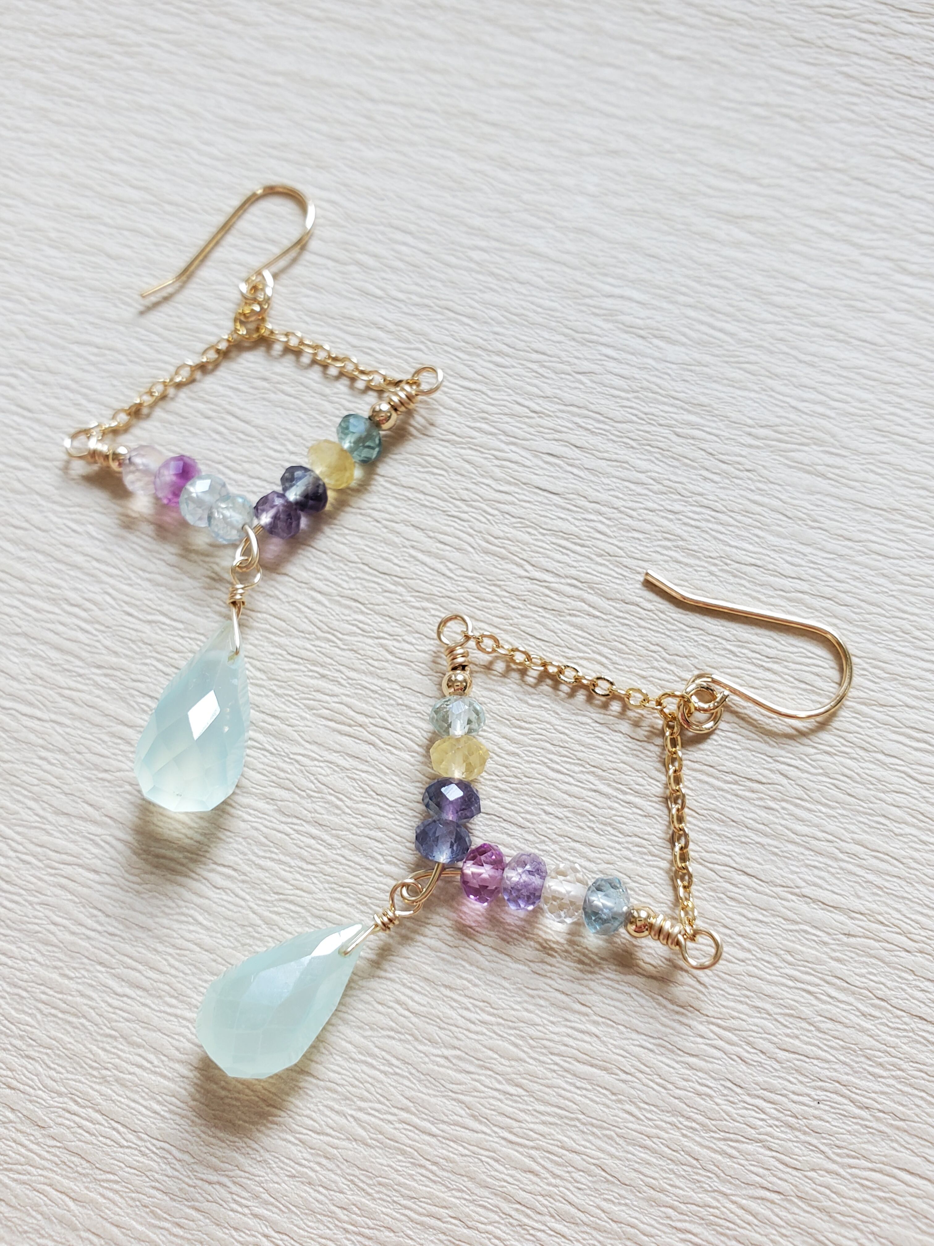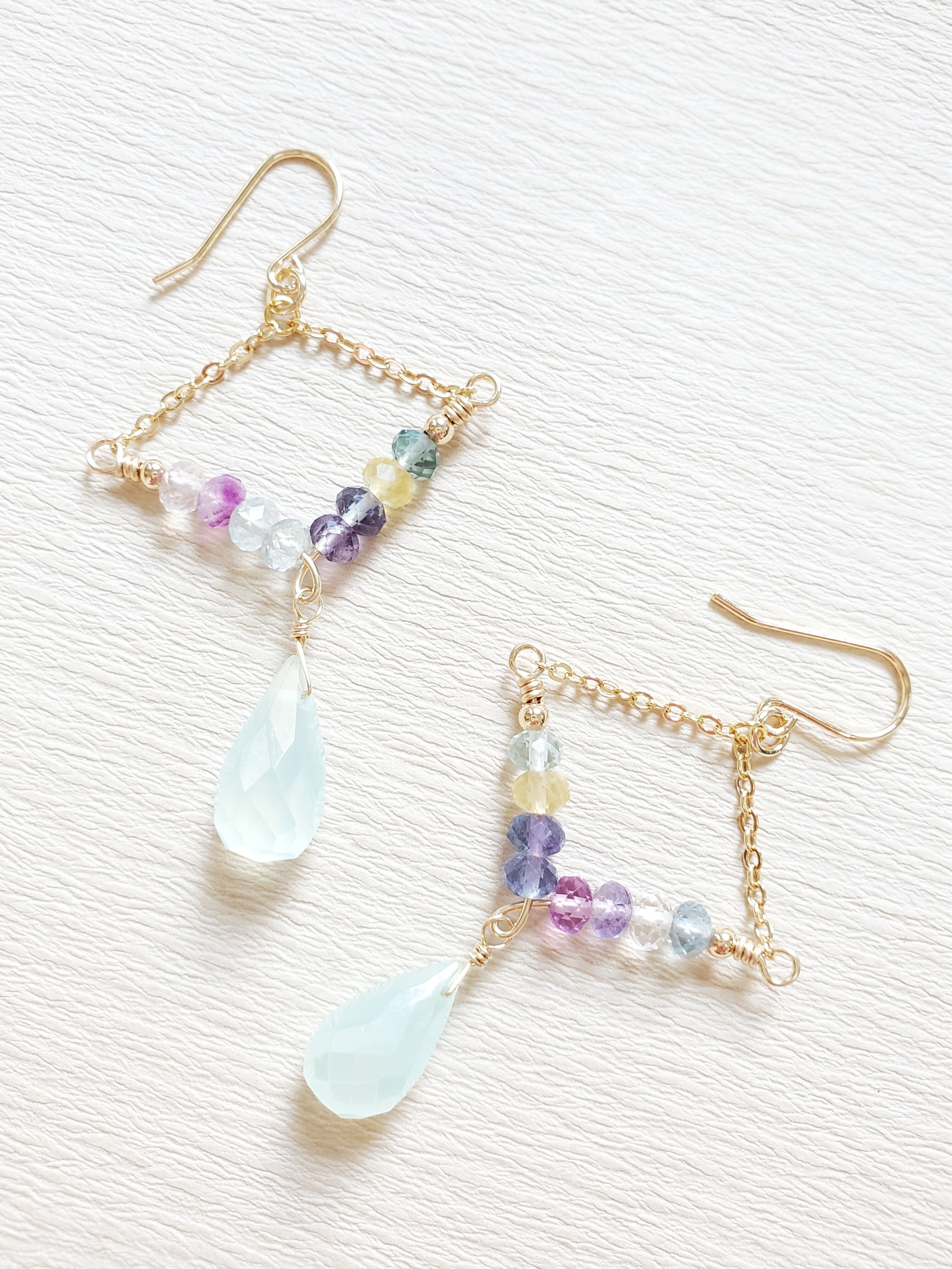 憂いのあるニュアンスカラーのマルチカラーフローライトに爽やかなミントグリーンのカルセドニーを合わせて華やかなシャンデリアピアスに仕上げました。