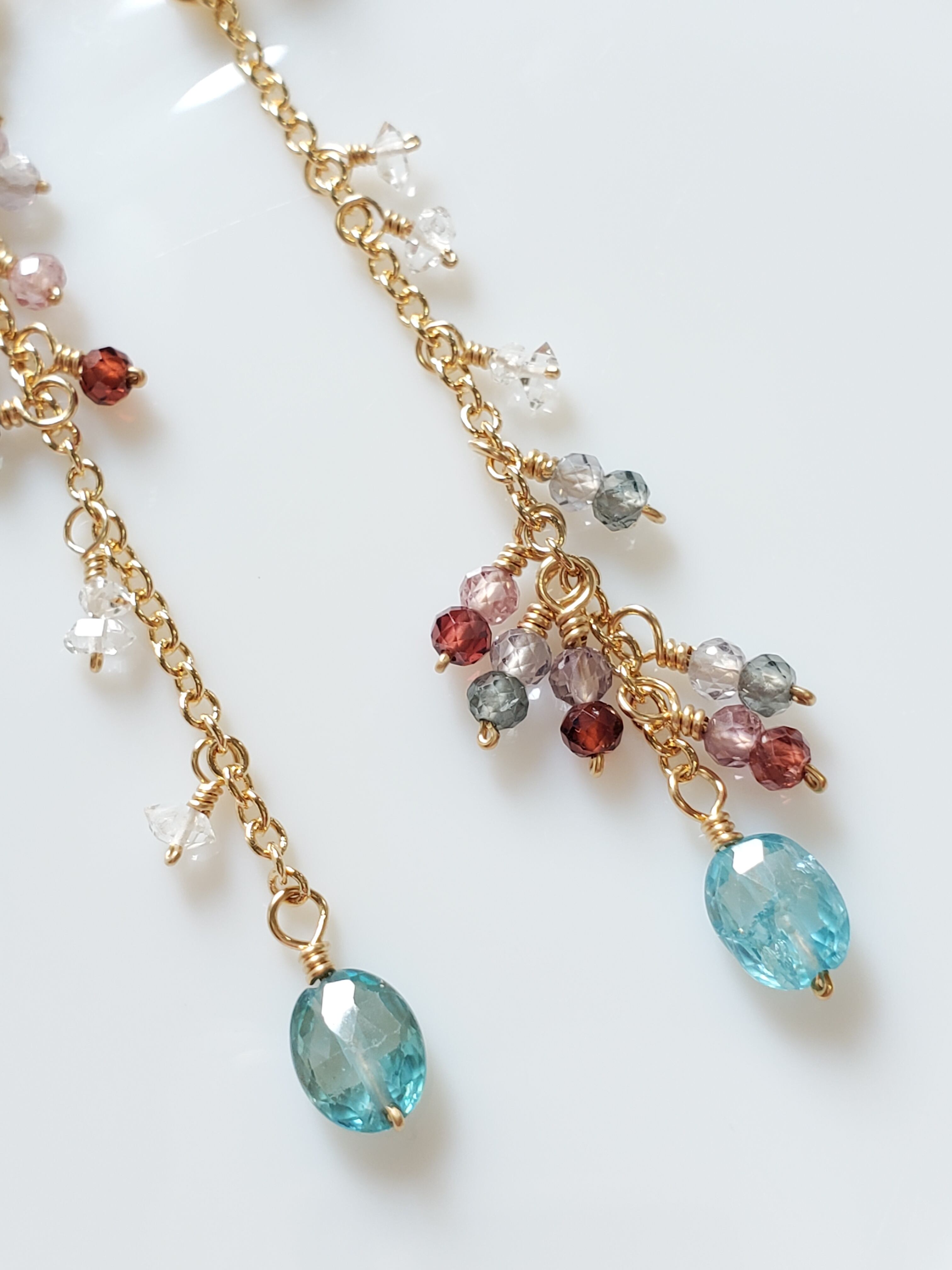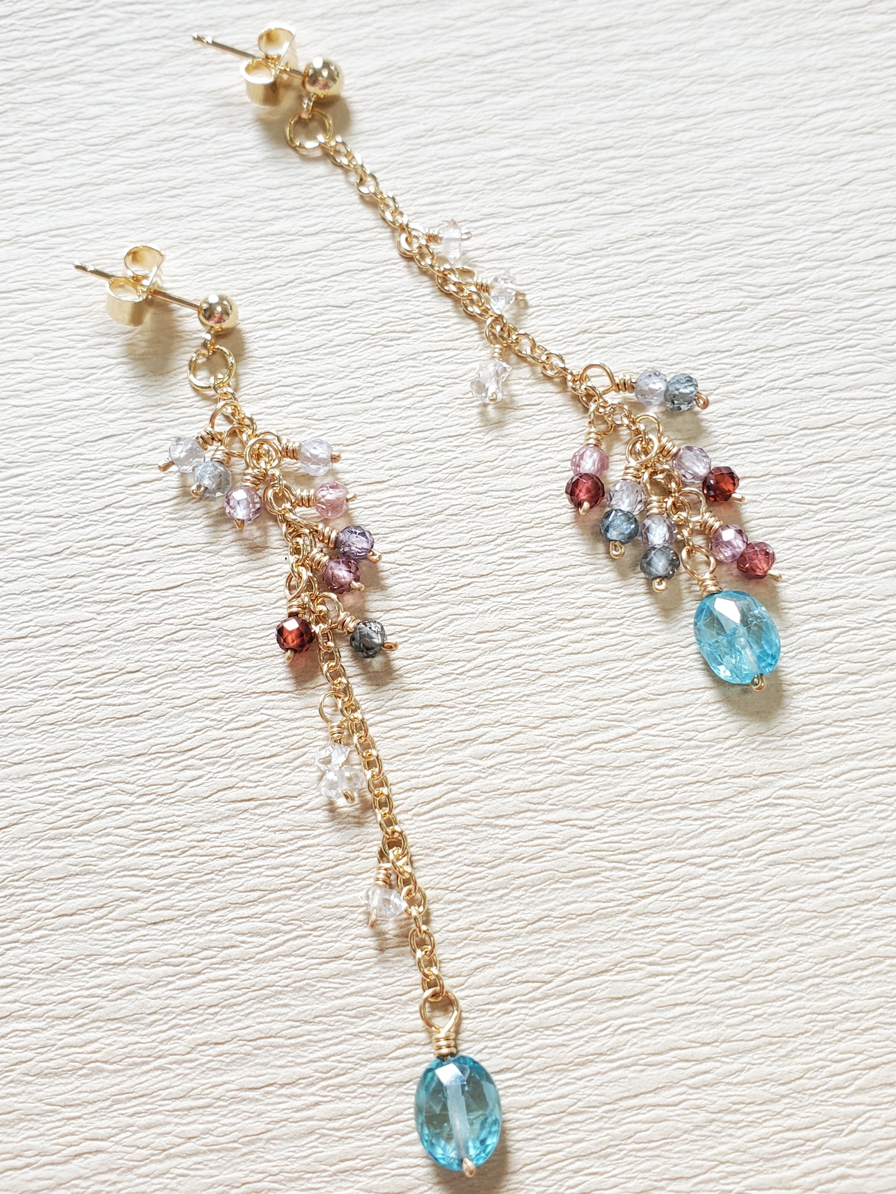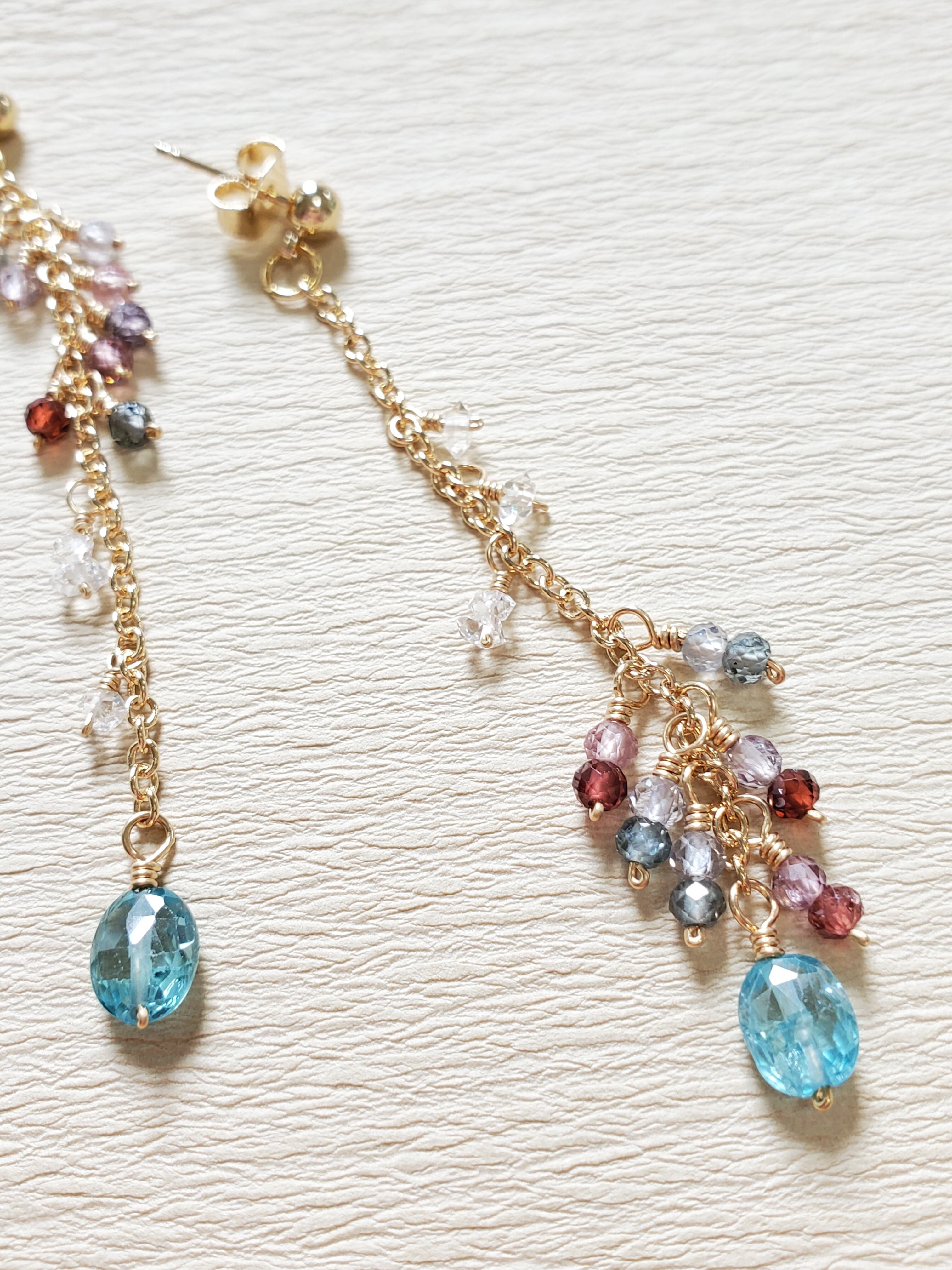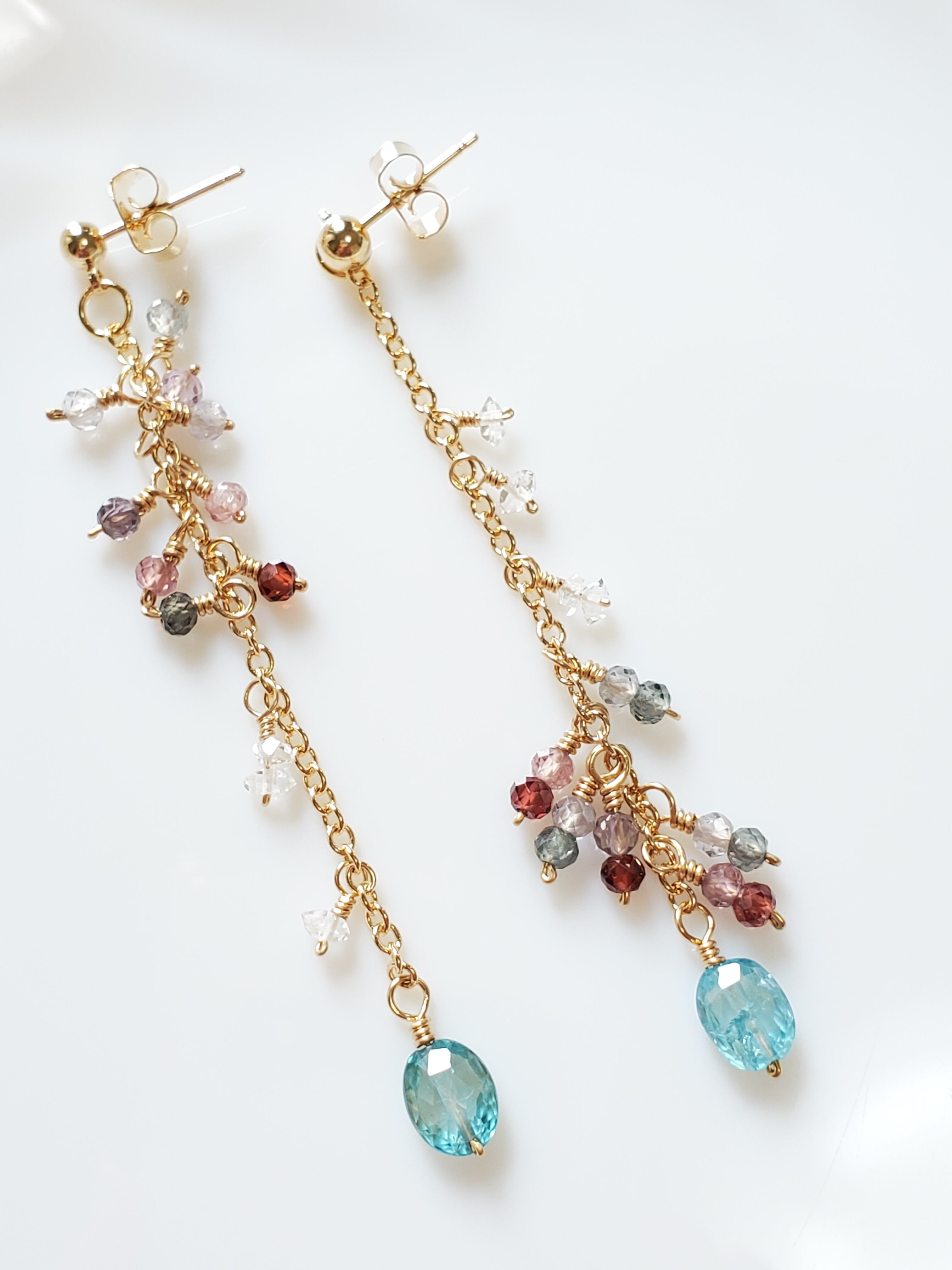 鮮やかな天然ブルージルコンにマルチカラースピネルやハーキマーダイヤモンドを合わせて華やかなピアスに仕上げました。