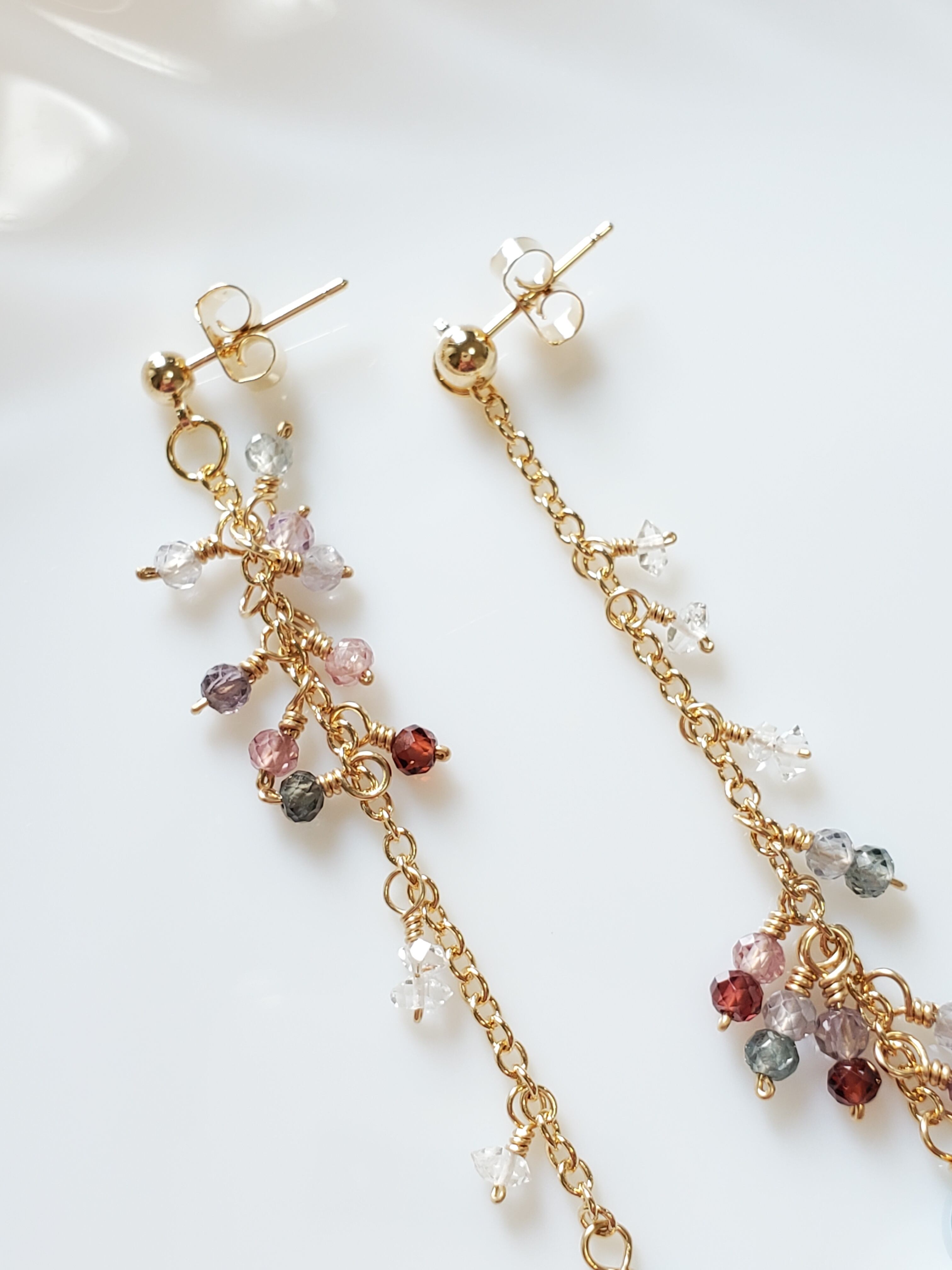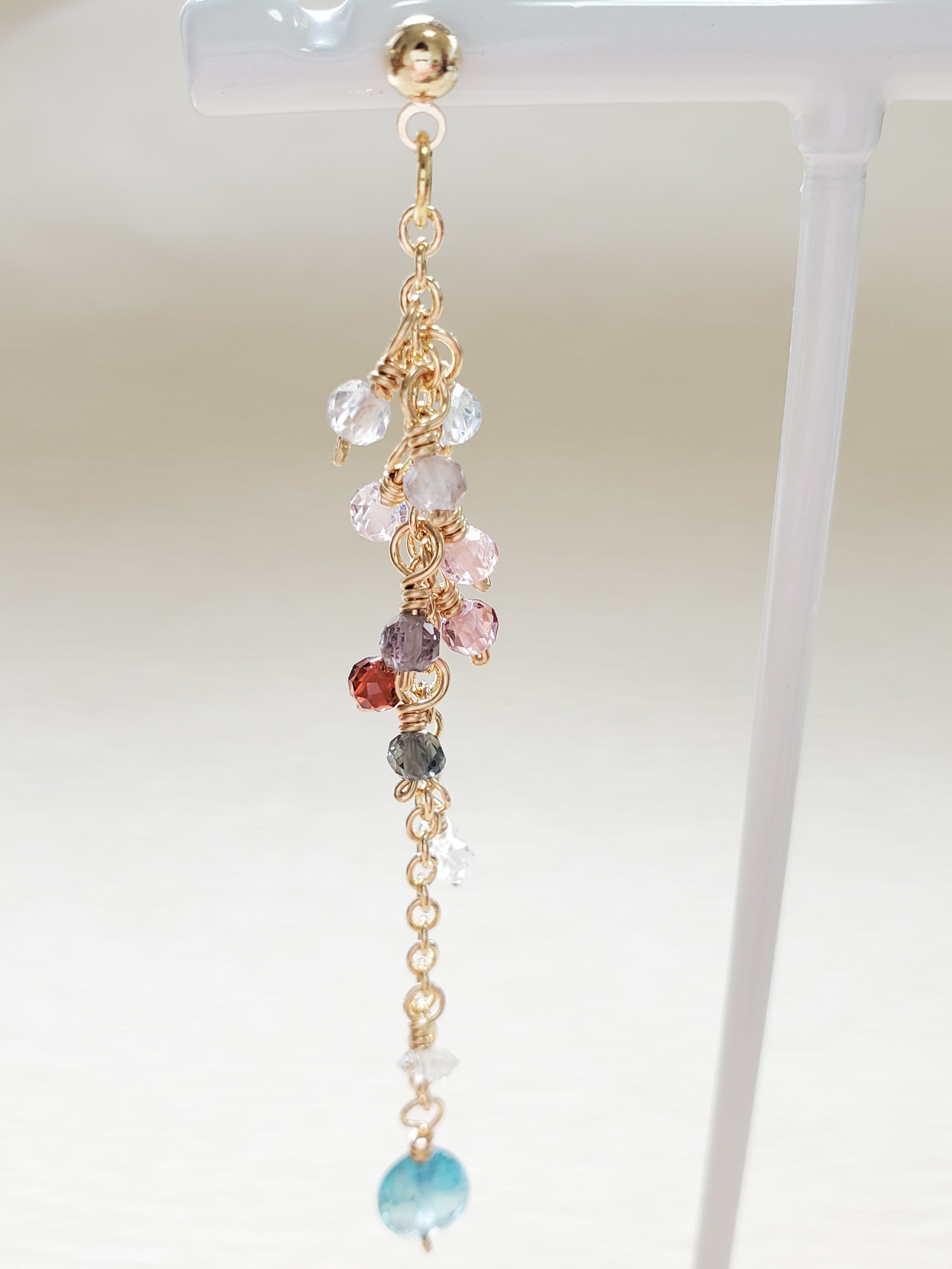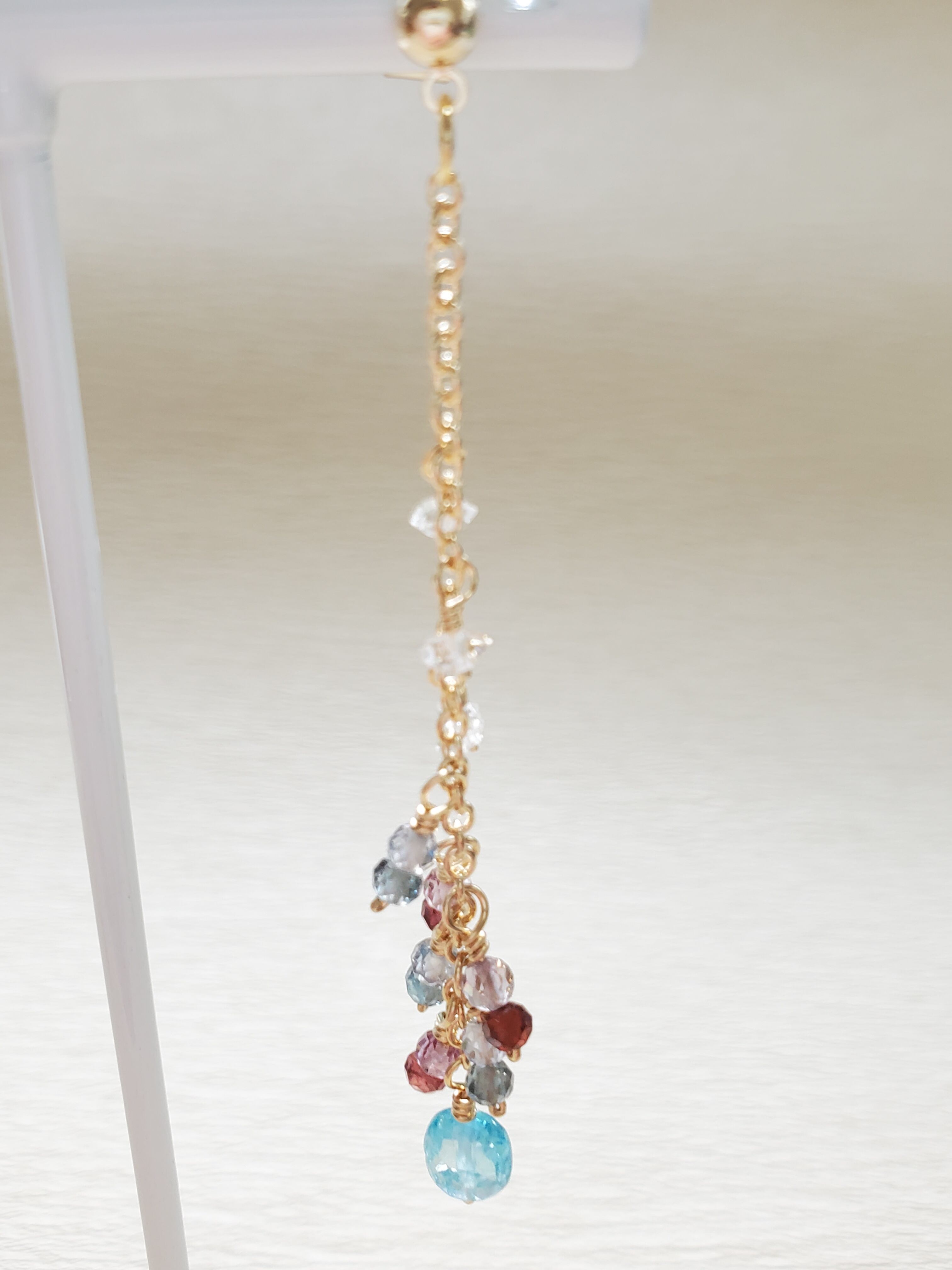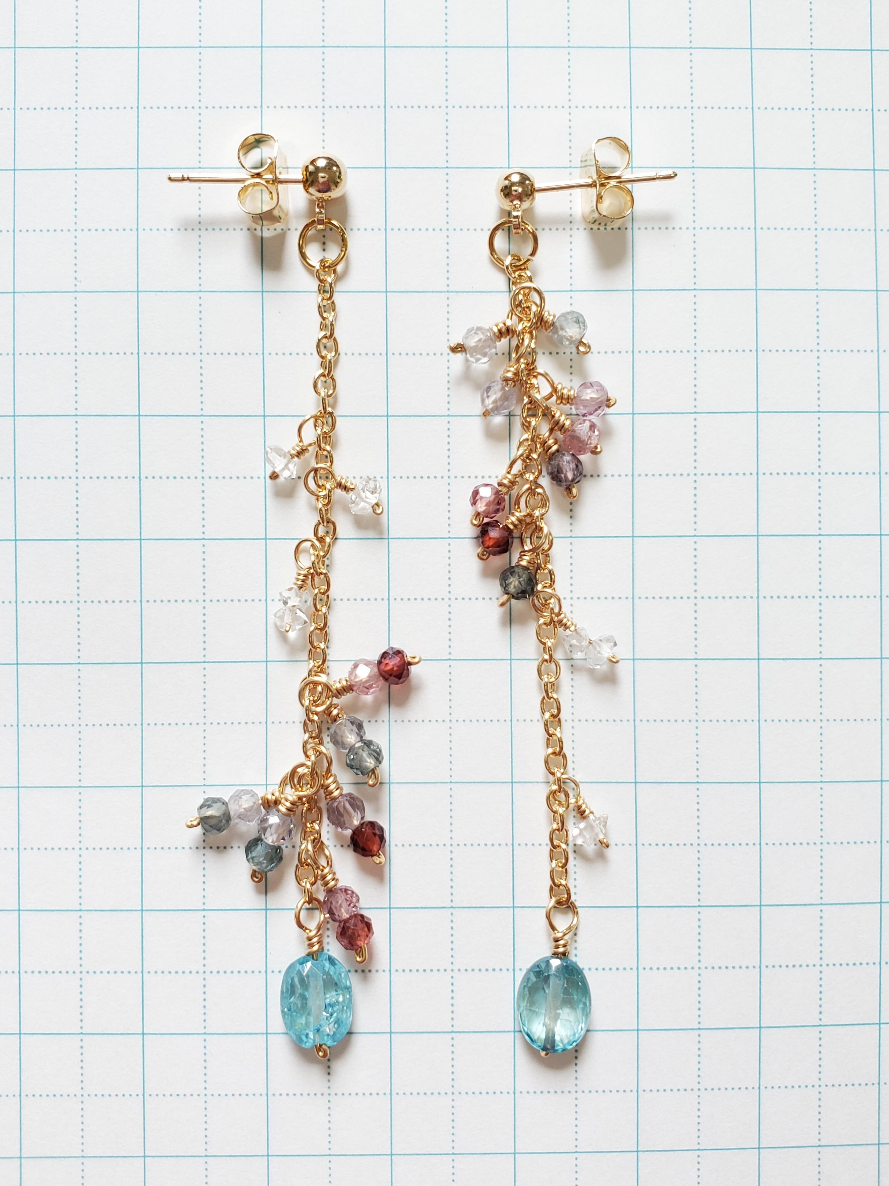 鮮やかな天然ブルージルコンにマルチカラースピネルやハーキマーダイヤモンドを合わせて華やかなピアスに仕上げました。