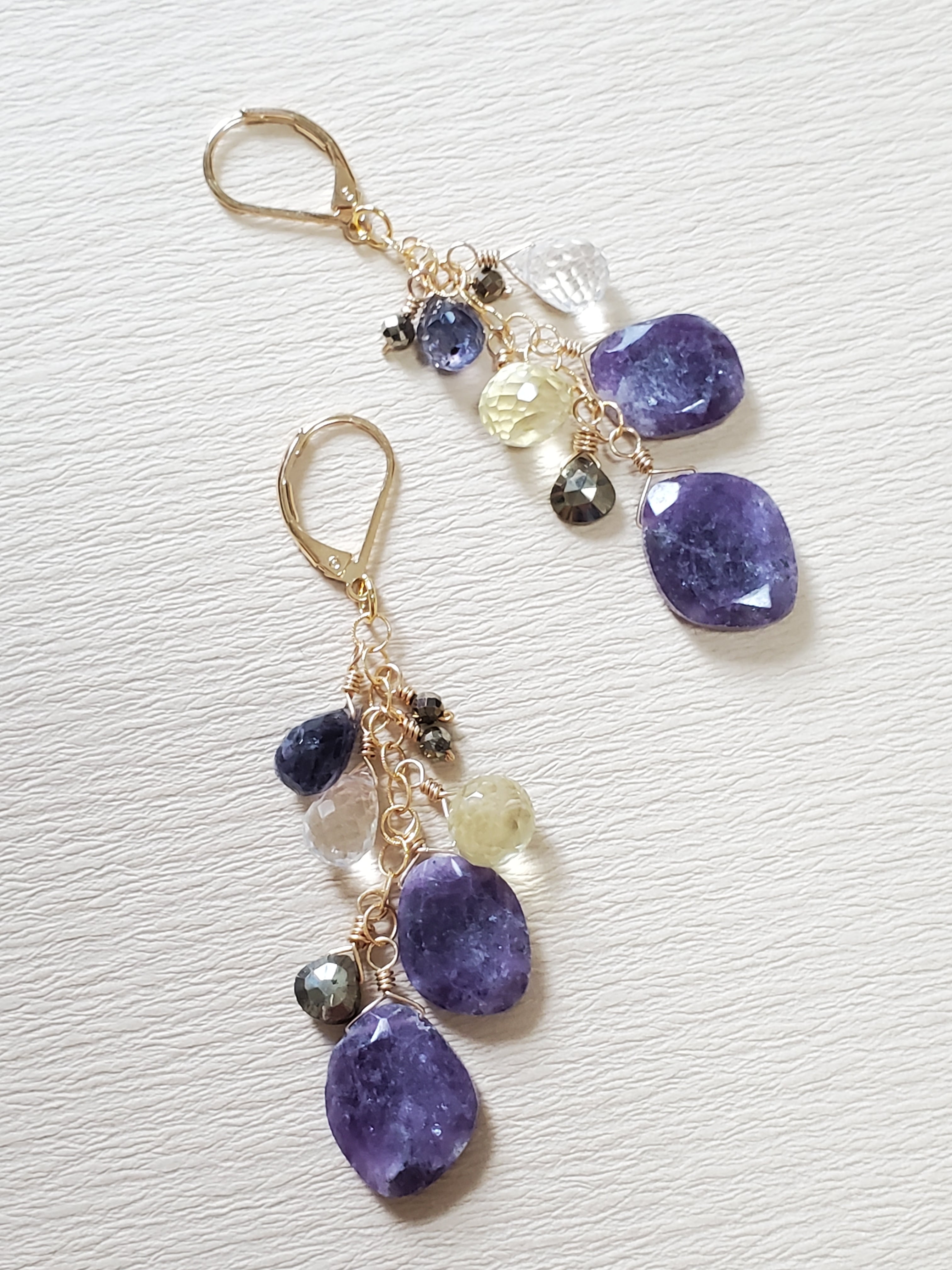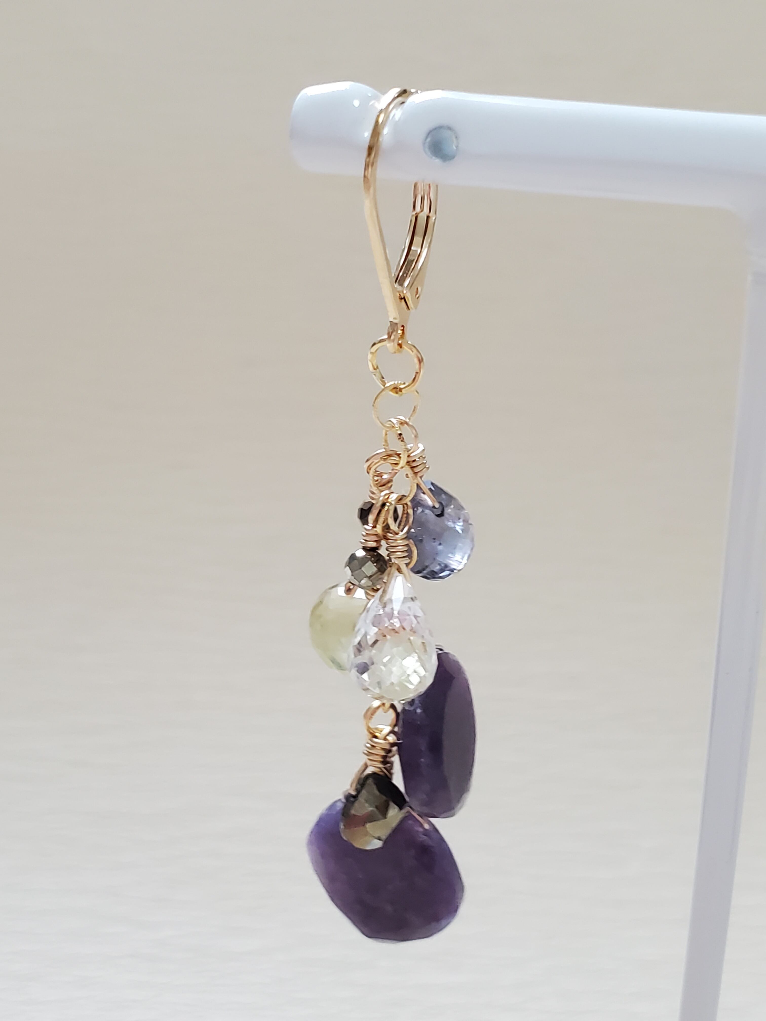 趣のある葡萄色のレピドクロサイトに瑞々しい透明感のある石を合わせて爽やかに、さらにパイライトで輝きも加え、存在感のある華やかなピアスに仕上げました。