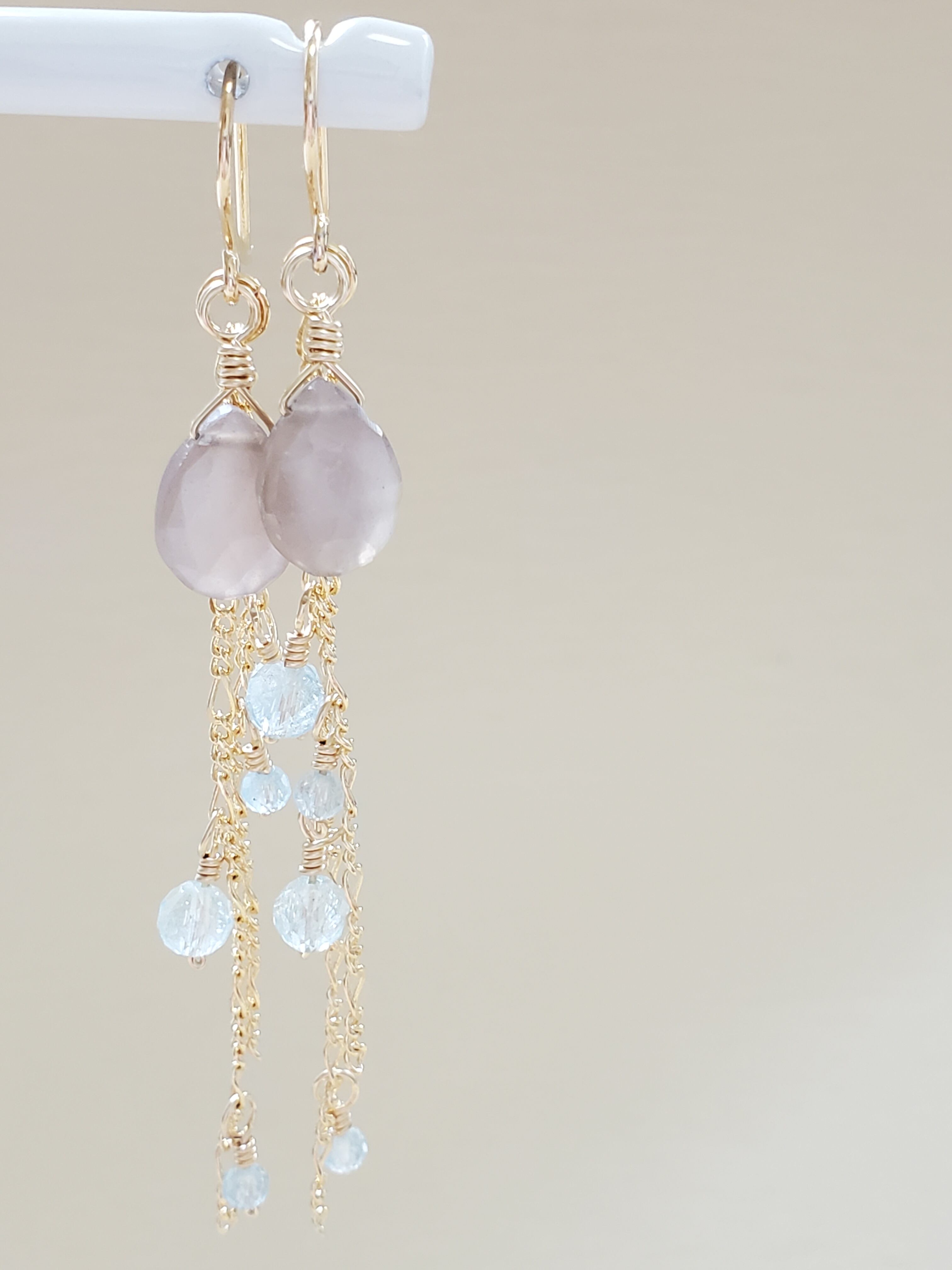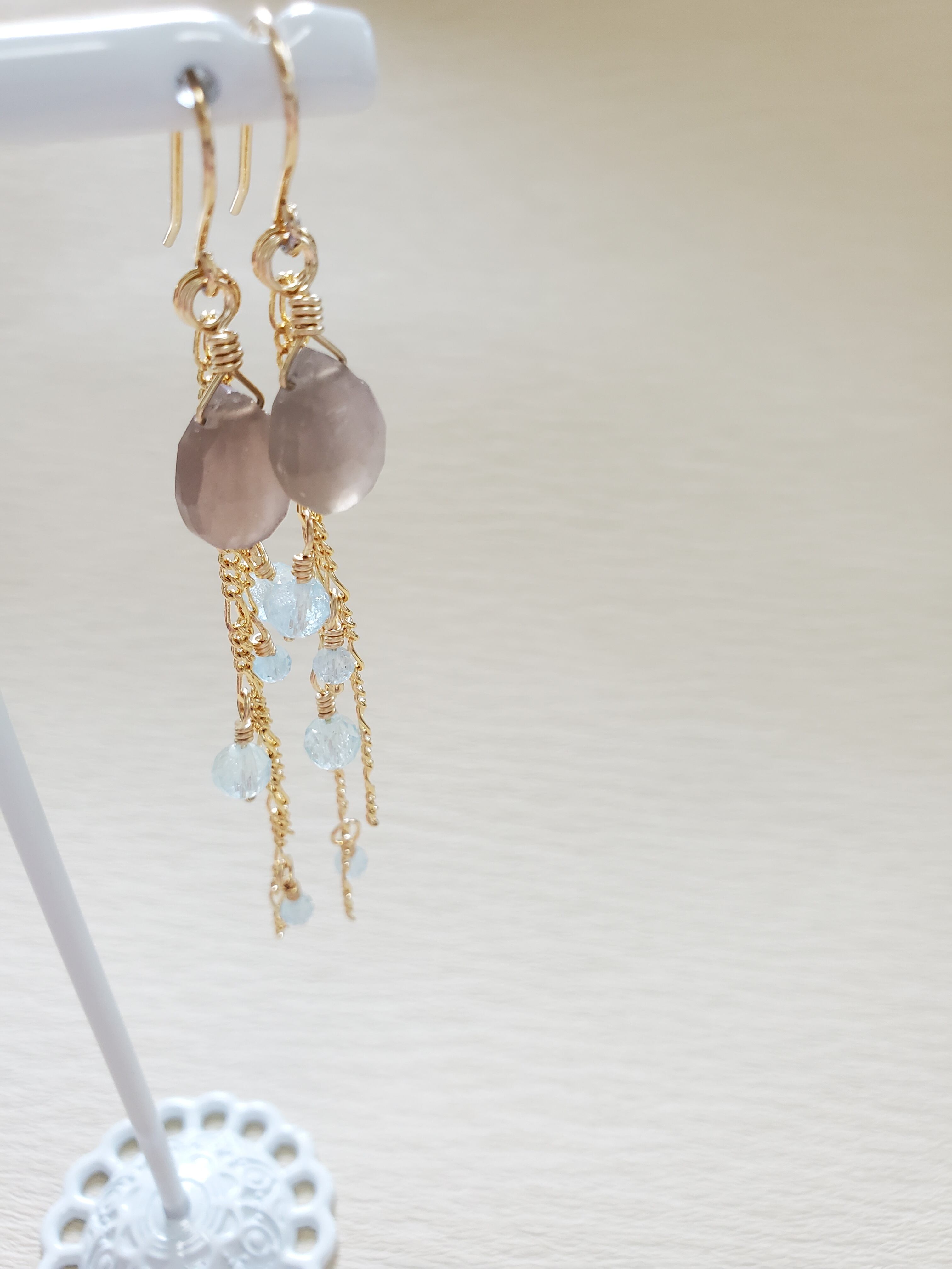 ☆カフェラテのようなクリーミーな色味のムーンストーンに滴る雫のようにアクアマリンをぶら下げて爽やかさも出し、バランスをとりました。