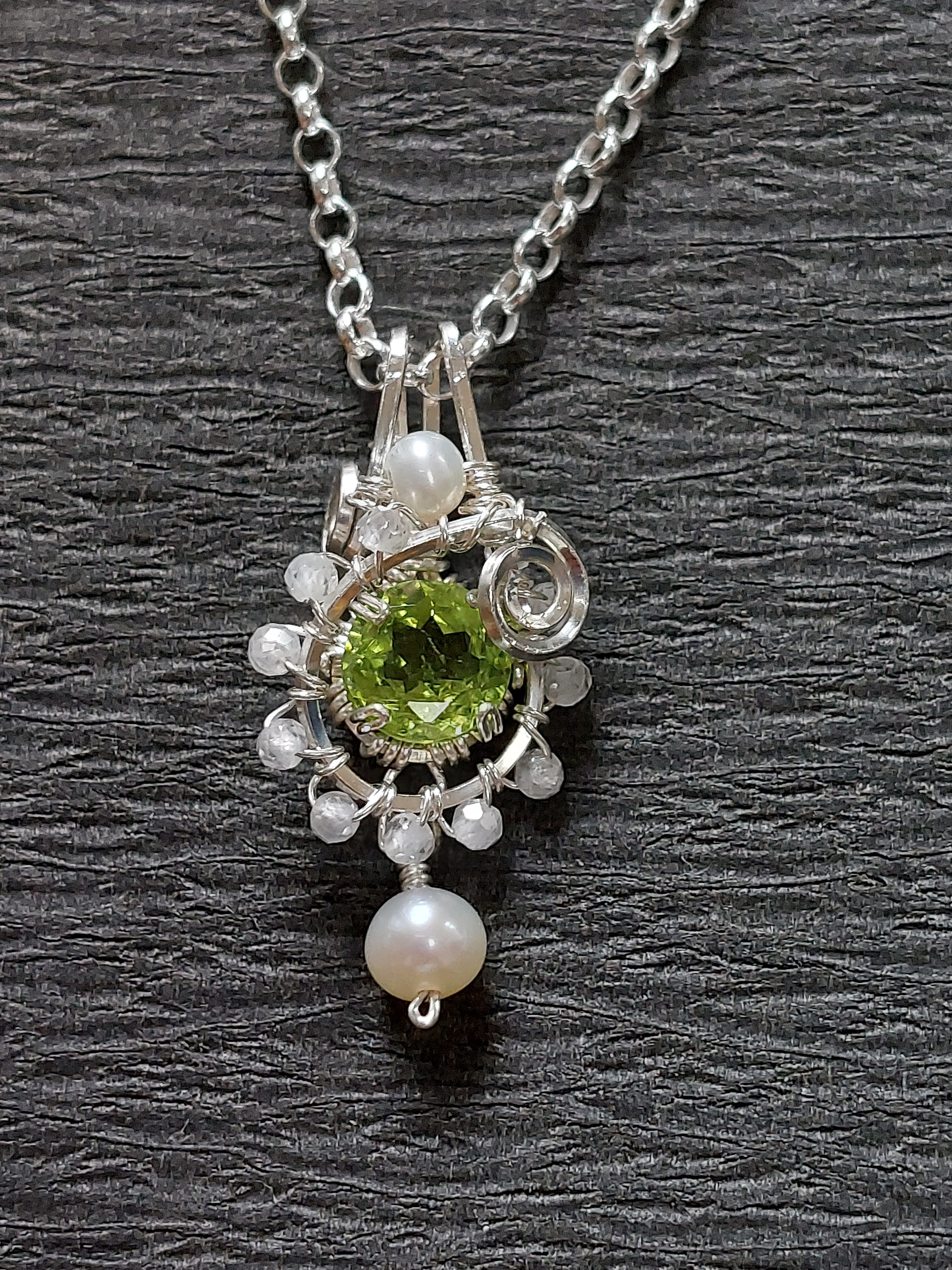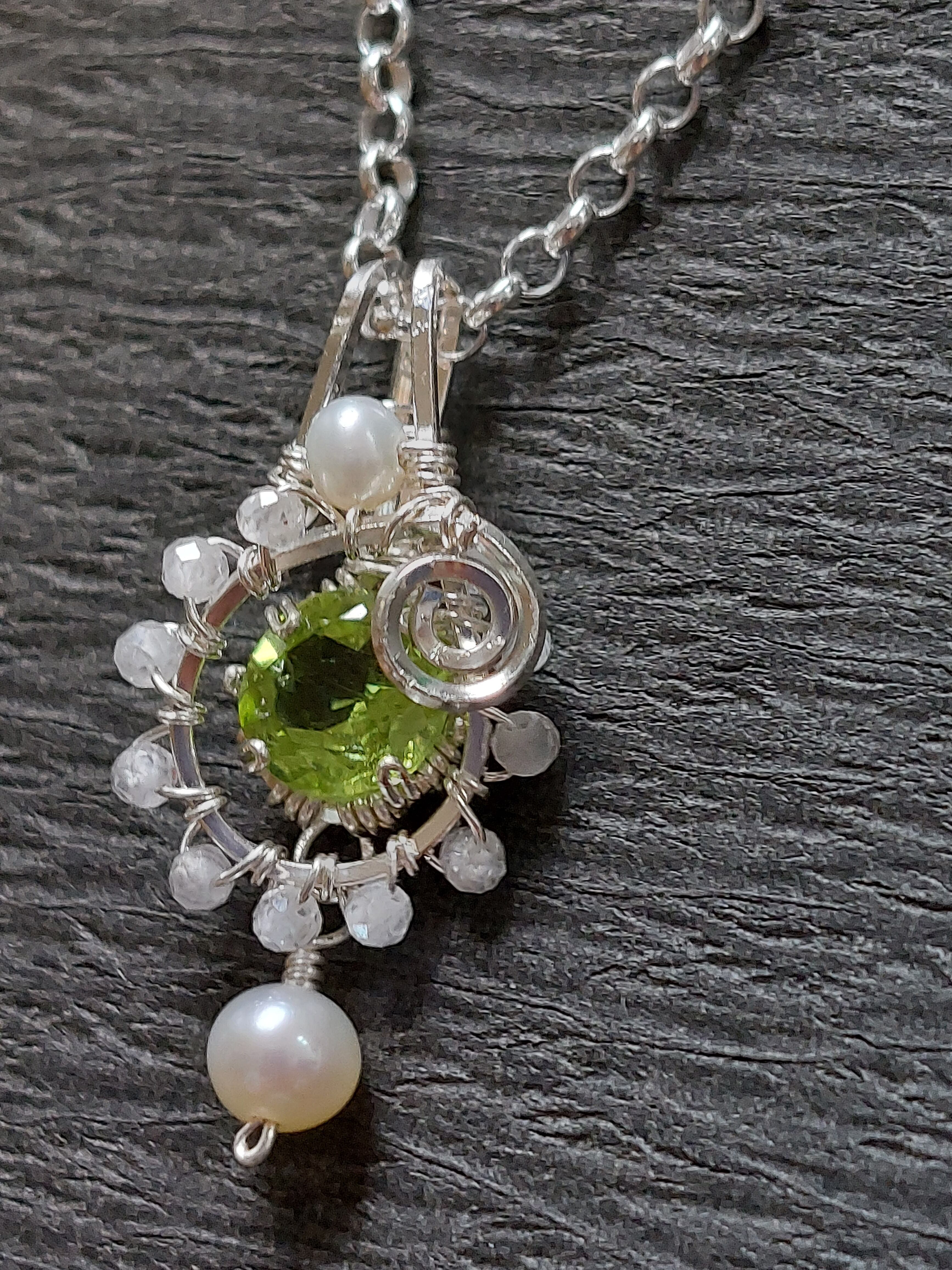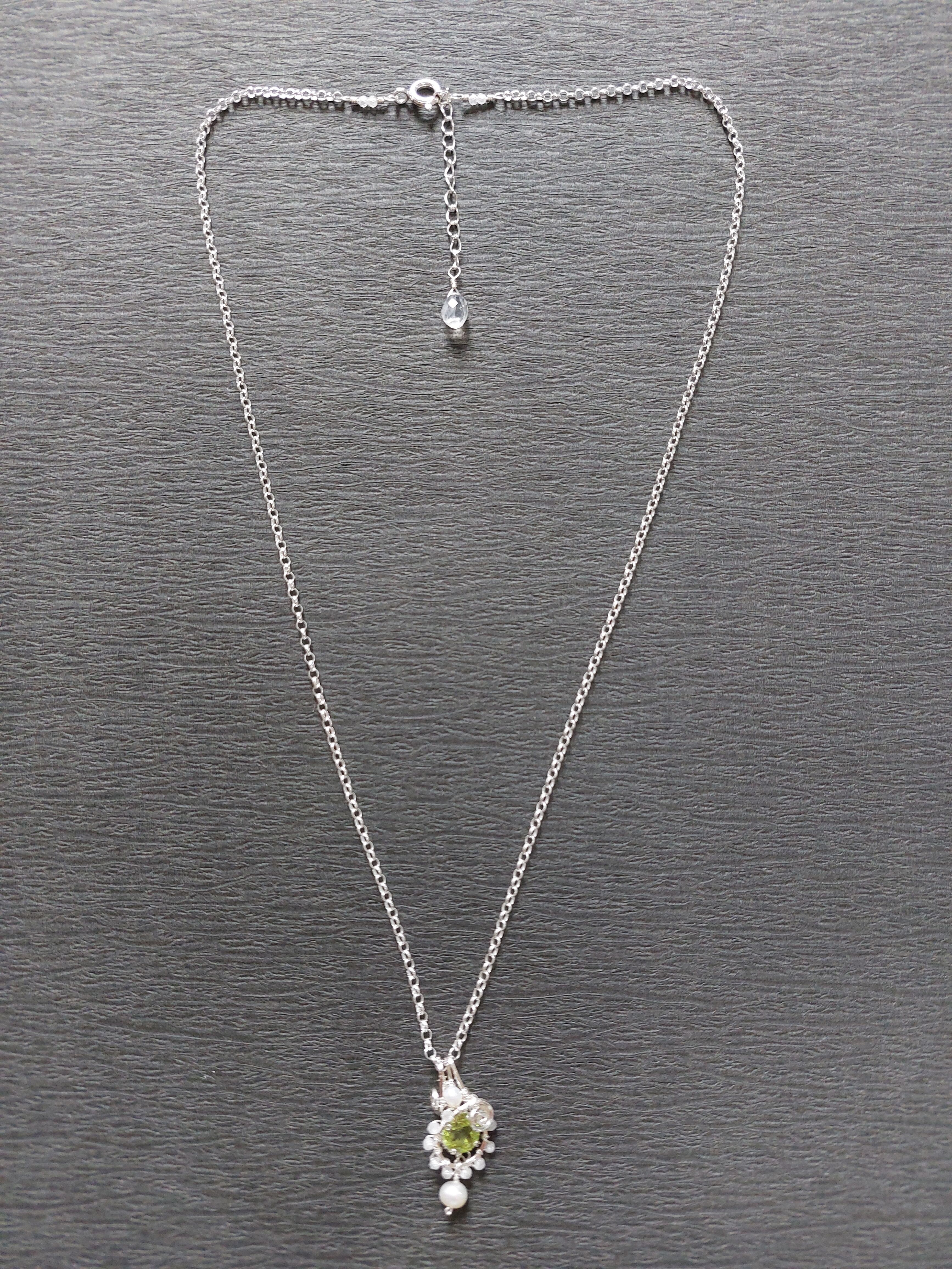 8月の誕生石であるペリドットを中心に、シンプルな装飾で、さりげなく華を添えてくれるようなネックレスに仕上げました。